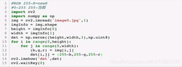 彩色图像的颜色反转,则需要知道的是彩色图像是有三个颜色空间的,也就是说它的深度为3,则需要将每个像素点对应的RGB的值与255相减即可,接下来是代码截图: