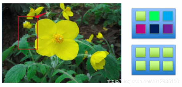 蓝色区域是一张图片,黄色区域是我们选择的一个200x300的矩形ROI区域,选择这个部分作为马赛克效果的区域,而我们这里的红色区域则代表,我们选择10x10的矩形框作为像素点的同步,红色区域100个像素点都为一个像素值,则可以将整个黄色区域进行模糊的马赛克处理。