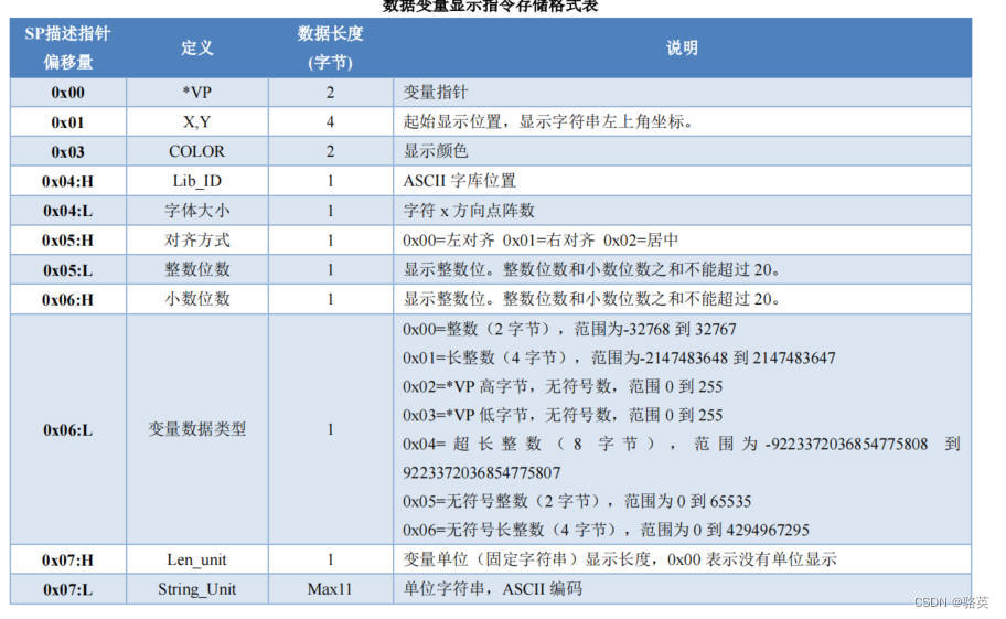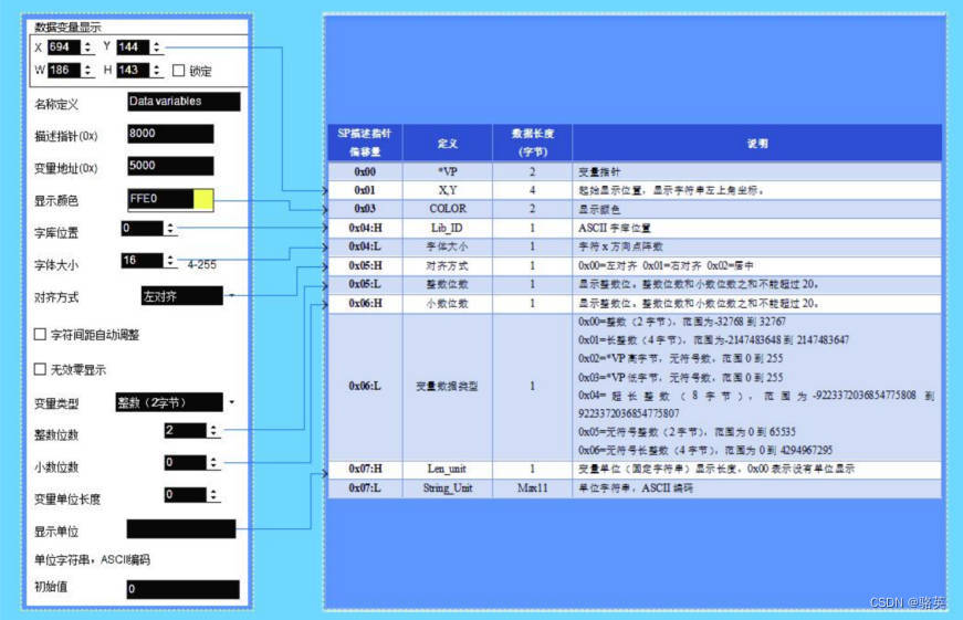 下面以 “ 数据变量显示”控件作为例子讲解描述指针用法,其他控件以此类推,如下表, “SP 描述指针偏移量 ” 表示在描述指针地址基础上需要偏移(增加)的地址长度,其单位是 “Word”字长度, “ 定义”解释了这个偏移地址所代表的属性,常见的通用属性有:坐标位置、颜色、字符大小、对齐方式等,这是一个软件功能常见的属性,其他属性根据类型的不同则不一样,需要注意的是部分属性占用一个字长度地址或多个地址,部分属性只占用一个字节地址,如下表, 0x04:H 高字节表示字库位置, 0x04:L 低字节表示字体大小,理解了高低字节的写法即可理解描述指针用法。