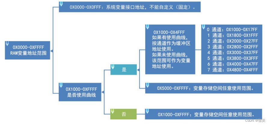 RAM 空间固定 128KB,128*1024/2=65536(Word),即 0~65535,分割为 0x0000-0xFFFF 子空间范围。每1个变量地址(Word)对应相应空间的 2 字节(Byte),每 1 个字节对应相应空间的 8 个位(bit)。其中 0x0000-0x0FFF 是系统变量接口地址空间,给迪文规划使用,用户按照地址接口选择使用所需功能,这片地址用户不能自定义; 0x1000-0xFFFF 变量存储空间用户可以任意使用。如果 8 通道曲线同时使用,0x1000-0x4FFF 将作为曲线缓冲区地 址,此时该部分变量地址不能被其他控键使用,其他控键地址使用范围为:0x5000-0xFFFF。
