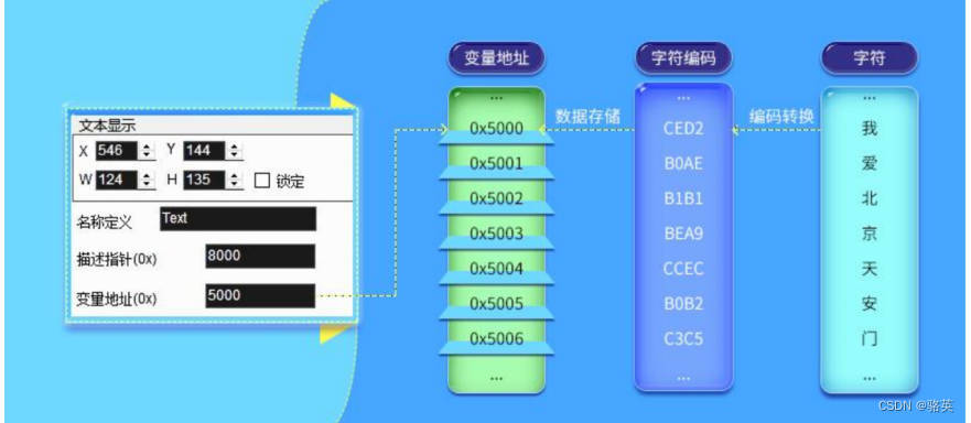 变量地址是 RAM 空间中储存某一个或多个变量的子空间的首地址,在该地址指向的空间中储存了显示变量的 编码或状态变量的值。例如,将一个文本显示控件变量地址设置为 0x5000,控件中显示的文本内容为“我爱北京天 安门”,那么在 RAM 空间中的储存方式如下图所示。可以看出,每个地址中可储存 2 Byte 内容。