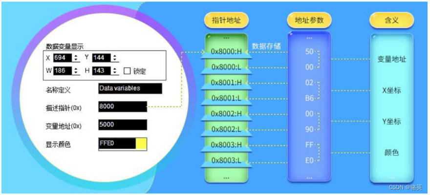 描述指针是 RAM 空间中储存描述某一变量属性的子空间首地址,在该地址指向的空间中储存了显示变量的各 项属性值,如显示坐标、颜色、字体大小等。需要指出的是,描述指针与变量指针共用 RAM 空间,分配变量地址 时应避免空间的重合。