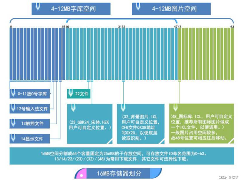 16MB Flash 存储器可以看作是分割成 64 个容量固定为 256KB 的子空间,可存放的文件 ID 号范围为 0-63。存 储器根据储存的文件内容不同,主要分为两部分: ( 1 ) 4-12MB 的字库空间,可以保存 BIN 、 HZK 、 DZK 格式文件,文件 ID 范围 00~47 。 (2 ) 4-12MB 的图片空间,可以保存背景图片库 ICL 文件、图标库 ICL 文件存储空间,文件 ID 范围 16~63 。 注意字库空间和图片空间有重叠部分,ID 命名时需注意避免冲突。 对于 T5L1 CPU 平台,打包后的 ICL 文件中,单个图片文件大小不要超过 256KB , T5L2 CPU 平台单个文件 不超过 768KB 。下载文件必须放在 SD 卡根目录 DWIN_SET 文件夹中,并且必须是 4KB 扇区、 FAT32 格式的SD 或 SDHC 卡。 推荐用户从 23 号起始位置开始放字库或者图标库等文件;例如 32 号起始位置开始放背景图 .ICL 文件, 背景 图片存放位置需要通过 SD 卡配置 CFG 文件自定义 , CFG 文件 0x08 位置的值调用背景图片 .ICL 文件保存位置 ID, 例如 32_ 背景图片 .ICL ,需 CFG 文件 0x08 地址写 0x20 。 共用区间范围划分熟悉后用户可自行设置分配,例如用户 23 号位置字库文件占用 10 个区间,此时背景图片位 置则不能从 32 开始,而是需要从 33 号位置开始。如果用户有某张页面 ID 图片显示为黑屏,而其他张显示正常,可检查该页面大小是否超过 256KB。 注:32_背景图片.ICL,占用的大小为478kb,所以下一个ICL的命名要从 32+(478/256(取整))=32+2=34开始命名。