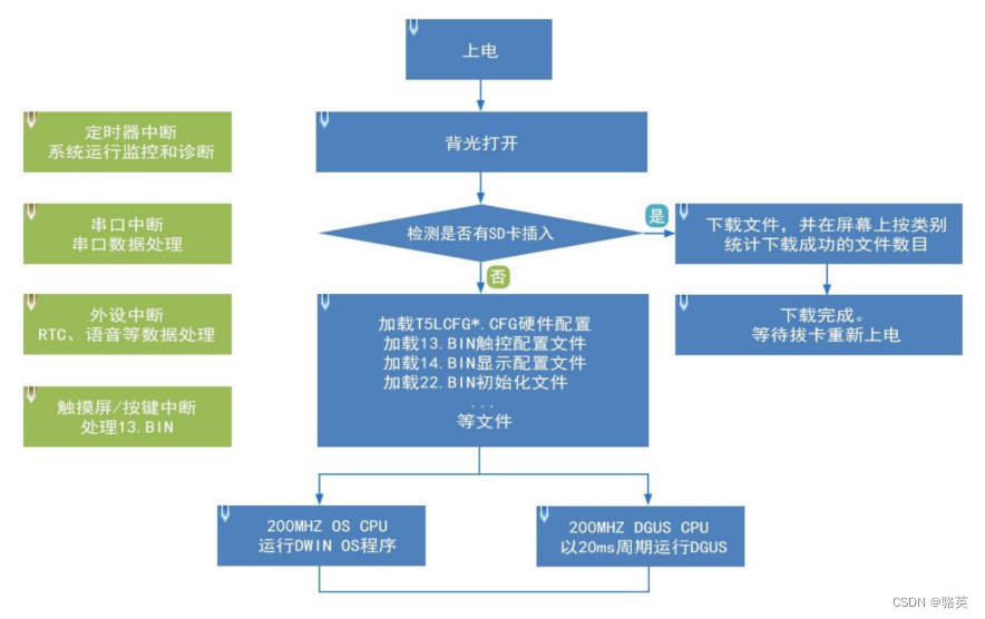 在 DGUS 开发平台中是通过使用控件来进行开发的。控件中封装了定义好的数据的属性和方法,用户只需要在 PC 端对控件进行配置和使用即可。 DGUS 中已经将常见的人机交互功能所需的控件定义好,软件使用方便、高效, 在一些中、小型工业自动化项目应用中,当整个系统由一些相对独立、功能完善的组件(如支持 Modbus 协议的温 控仪或其他二次仪表)构成时,用户可以直接把 DGUS 当作主机使用,用 485 网络把设备和 DGUS 屏组成一个网 络,基于 DGUS 屏上搭载的二次开发平台来直接开发用户主控软并直接在 DGUS 屏上运行,替代用户 CPU 的工作。 T5L_DGUS II 平台规定了 DGUS 的刷新周期是 20ms ,这意味着在每一个 20ms 的周期内,要将 13.BIN 和 14.BIN 中的内容全部读取一次。目前, DGUS II 的开发平台已经支持每一个页面放置高达 255 个变量,可见 DGUS II 的处 理能力是非常强的。同时, OS 运行模式:实时运行( 1 个 8051 核运行 GUI , 1 个 8051 核在 DWIN OS 平台运 行用户代码),与 DGUS 的运行是完全独立分开的。因此,开发者也无需担心当系统中同时运行 DGUS 和 DWIN OS 时,二者是否会相互影响。 基于 T5L ASIC CPU 的 DGUS II 软件平台,主要特点包括: ( 1 )基于 T5L 双核 ASIC , GUI 和 OS 核均运行在 200MHz 主频(可定制 350MHz 主频版本),功耗极低。 (2 ) 16Mbytes 低成本 SPI Flash( 可以扩展到 64Mbytes NOR Flash 或 48Mbytes Nor Flash+512Mbytes NAND Flash), JPEG 图片、图标压缩存储,可以指定背景图片存储空间大小。 (3 ) 512Kbytes Nor Flash 片内用户数据库。 (4 ) 256Kbytes 数据变量空间。 (5 )每页多达 255 个显示变量。 (6 )支持标准 T5 DWIN OS 平台或 8051 开发 OS CPU 核: 硬件可以引出 20 个 IO 、 4 路 UART 、 1 路 CAN 接口、多路 AD ,提供定制服务。 (7 ) 20mS DGUS 周期, UI 极其流畅。 (8 )显示变量可以在应用中开启、关闭或修改,实现复杂的显示组合功能。 (9 )触控指令可以在应用中开启、关闭或修改,实现复杂的触控组合功能。 ( 10 )支持 SD 接口下载和配置,下载文件统计显示。 ( 11 )支持电容触摸屏灵敏度调节,方便用户前装面板(最厚到 6mm 钢化玻璃)应用。 ( 12 )数据变量显示,自动识并支持锯齿优化的 8bit 编码字库字符显示,以支持非标字体(比如数码管字体)、 非 半角字符的显示; 8bit 编码字库使用迪文工具软件生成。 ( 13 )支持预装组态模块开发模式,大幅度提升 UI 开发速度和质量。 ( 14 )支持 UART1 在线更新软件和字库,方便调试。 ( 15 )支持触摸屏手写输入法(需要定制硬件)。 ( 16 )支持数字摄像头实时监控显示(需要定制硬件)。3.软件处理流程
