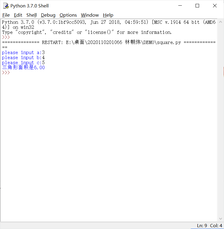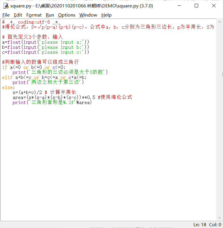 area=(s*(s-a)*(s-b)*(s-c))**0.5 #使用海伦公式