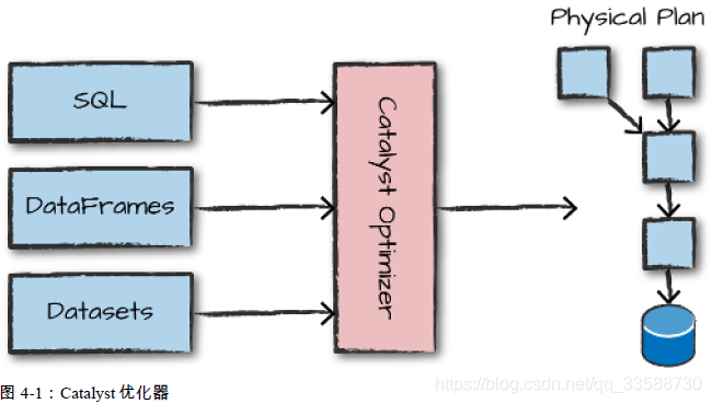 Spark使用catalog(所有表和DataFrame信息的存储库)来在分析器analyzer中解析(resolve)列和表格。如果目录中不存在所需的表或列名称,分析器可能会拒绝该未解析的逻辑计划。如果分析器可以解析它,结果将通过Catalyst优化器(Catalyst Optimizer),尝试通过谓词下推或选择操作来优化逻辑计划。用户也可以在定制源码时,扩展Catalyst优化器来支持自己特定的优化策略。