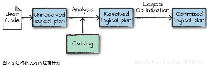 这个逻辑计划仅代表一组抽象转换,还不涉及executor或driver,它只是将用户的表达式集合转换为最优的版本,它通过将用户代码转换为未解析的逻辑计划来实现这一点。这个计划没有解析,因为虽然用户代码可能是有效的,但它涉及的表或列可能存在也可能不存在。