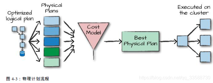 6. 在成功创建优化的逻辑计划后,Spark开始执行物理计划流程。物理计划(通常称为Spark计划)通过生成不同的物理执行策略,并通过代价模型进行比较分析,从而指定如何在集群上执行逻辑计划,具体流程如下图所示: