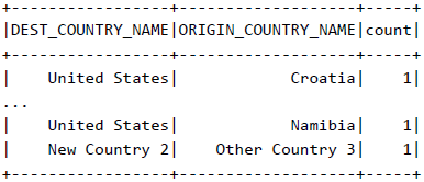 import org.apache.spark.sql.types.Metadataval myManualSchema =StructType(Array(StructField("DEST_COUNTRY_NAME", StringType, true),StructField("ORIGIN_COUNTRY_NAME", StringType, true),StructField("count", LongType, false,Metadata.fromJson("{\"hello\":\"world\"}"))