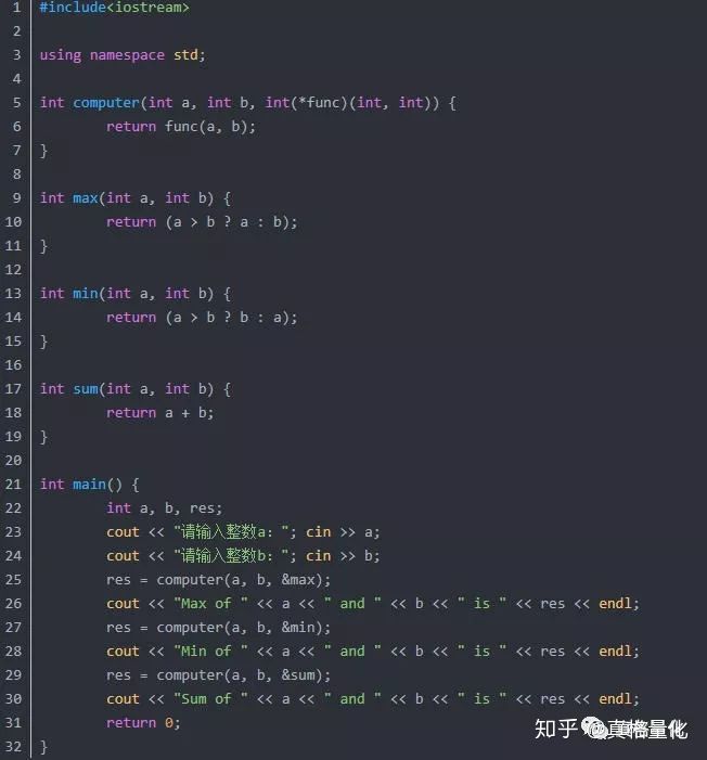 那么肯定有人会问,一个函数怎么可能做各种计算呢?——这个时候,我们在computer的形参中设置一个函数指针,每次调用的时候传递给它一个函数指针。