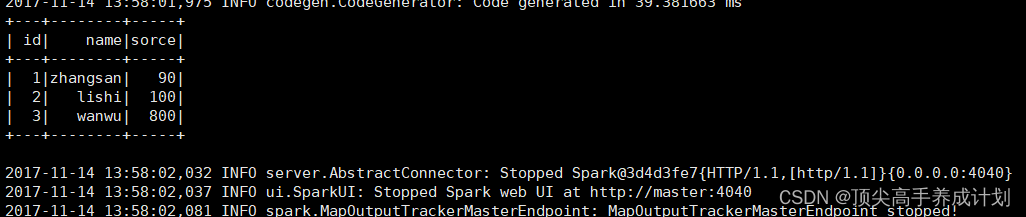 object ScalaDataFrame {def main(args: Array[String]): Unit = {val conf = new SparkConf()conf.setAppName("ScalaDataFrame")conf.setMaster("local")val spark = SparkSession.builder().appName("Spark SQL basic example").config(conf).getOrCreate()val dataFrame: DataFrame = spark.read.json("data/person.json")dataFrame.show()//打印元数据信息dataFrame.printSchema()//查询指定的列dataFrame.select(dataFrame.col("name")).show()//对于分数加一操作dataFrame.select(dataFrame.col("sorce").plus(1)).show()dataFrame.groupBy(dataFrame.col("id")).count().show()spark.close()}