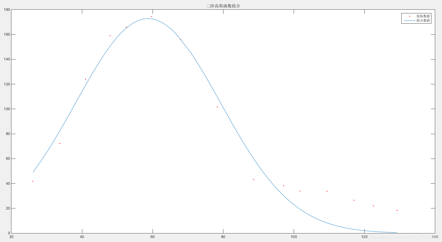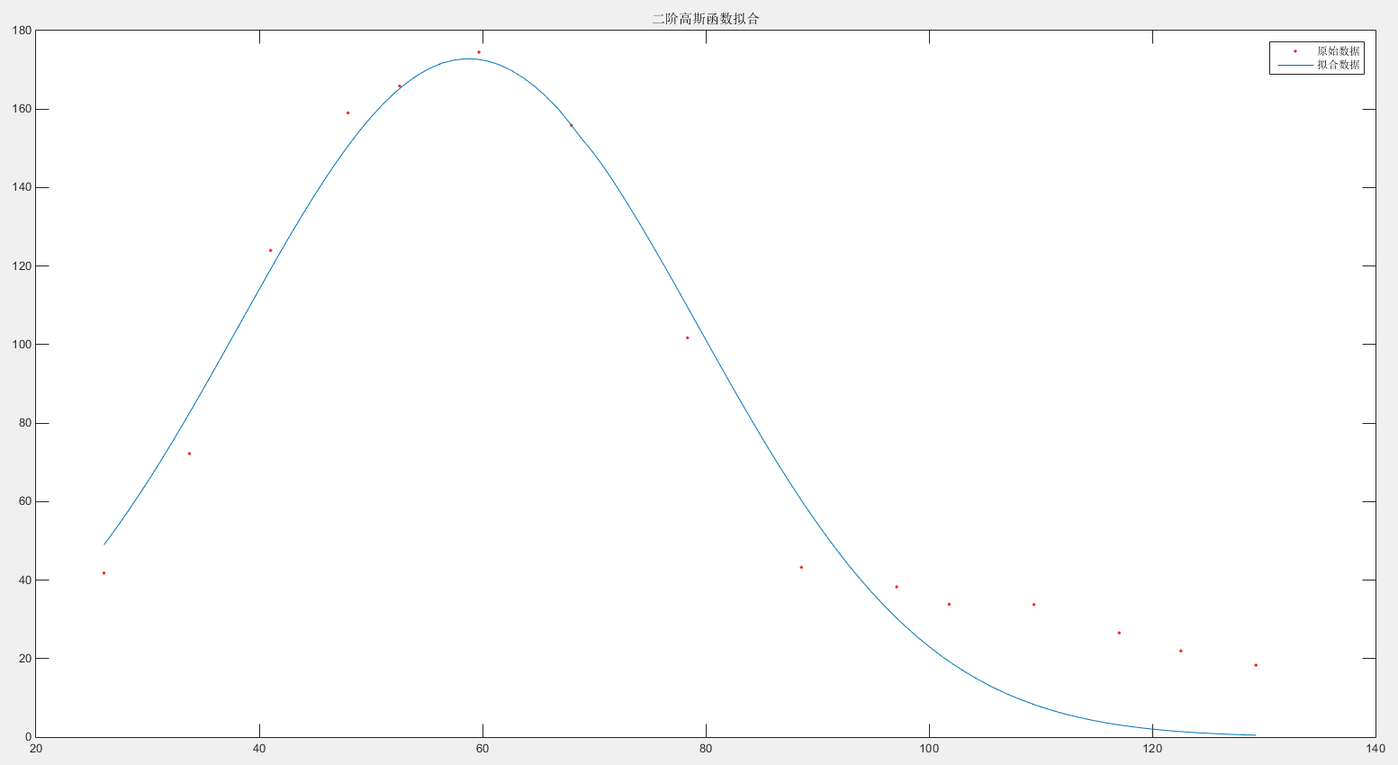 x=[129.2926,122.5626,117.0427,109.4045,101.8072,97.1049,88.5742,78.3659,67.9594,59.6875,52.5793,47.9517,41.0180,33.7457,26.0918];y=[18.33,21.96,26.54,33.79,33.84,38.28,43.245,101.72,155.88,174.5,165.87,159.03,123.98,72.22,41.8];fre = fit( x', y', 'Gauss2');beta=[fre.a1,fre.b1,fre.c1,fre.a2,fre.b2,fre.c2]';xx = linspace(min(x),max(x),100);yy = fre.a1*exp(-((xx-fre.b1)/fre.c1).^2) + ...fre.a2*exp(-((xx-fre.b2)/fre.c2).^2);plot(x,y,'r.',xx,yy);legend('原始数据','拟合数据');title('二阶高斯函数拟合');