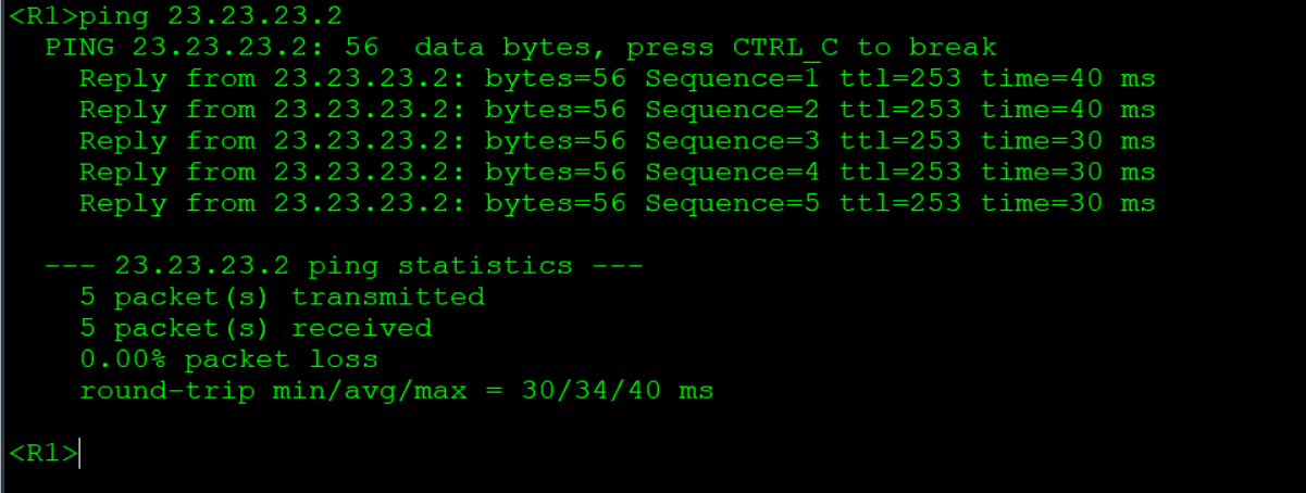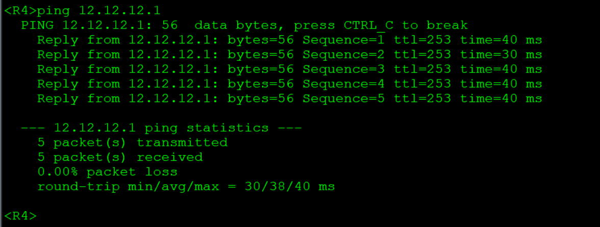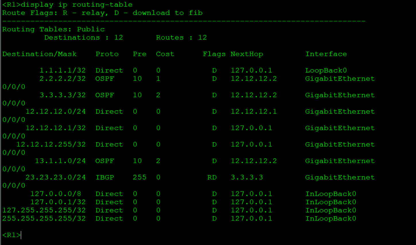 R1: int gi0/0/0 #进入接口gi0/0/0中 ip add 12.12.12.1 24 #配置IP地址和子网掩码 quit #退出接口配置模式 int loopback 0 #进入回环接口0 ip add 1.1.1.1 32 #配置IP地址和子网掩码 quit #退出接口配置模式 R2: int gi0/0/0 #进入接口gi0/0/0中 ip add 12.12.12.2 24 #配置IP地址和子网掩码 quit #退出接口配置模式 int gi0/0/1 #进入接口gi0/0/1中 ip add 13.1.1.1 24 #配置IP地址和子网掩码 quit #退出接口配置模式 int loopback 0 #进入回环接口0 ip add 2.2.2.2 32 #配置IP地址和子网掩码 quit #退出接口配置模式 R3: int gi0/0/0 #进入接口gi0/0/0中 ip add 13.1.1.2 24 #配置IP地址和子网掩码 quit #退出接口配置模式 int gi0/0/1 #进入接口gi0/0/1中 ip add 23.23.23.1 24 #配置IP地址和子网掩码 quit #退出接口配置模式 int loopback 0 #进入回环接口0 ip add 3.3.3.3 32 #配置IP地址和子网掩码 quit #退出接口配置模式 R4: int gi0/0/0 #进入接口gi0/0/0中 ip add 23.23.23.2 24 #配置IP地址和子网掩码 quit #退出接口配置模式 int loopback 0 #进入回环接口0 ip add 4.4.4.4 32 #配置IP地址和子网掩码 quit #退出接口配置模式