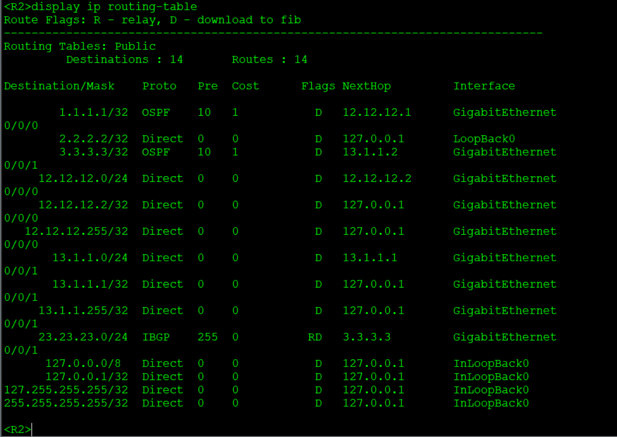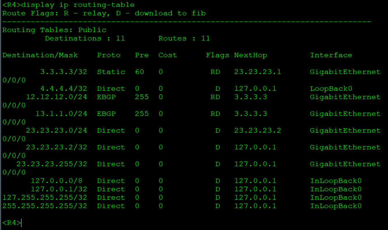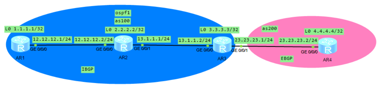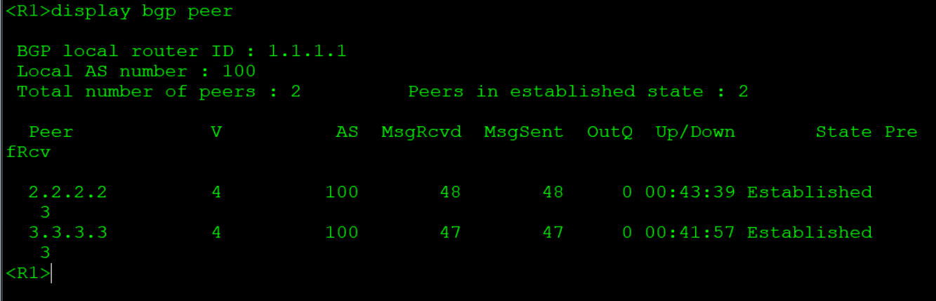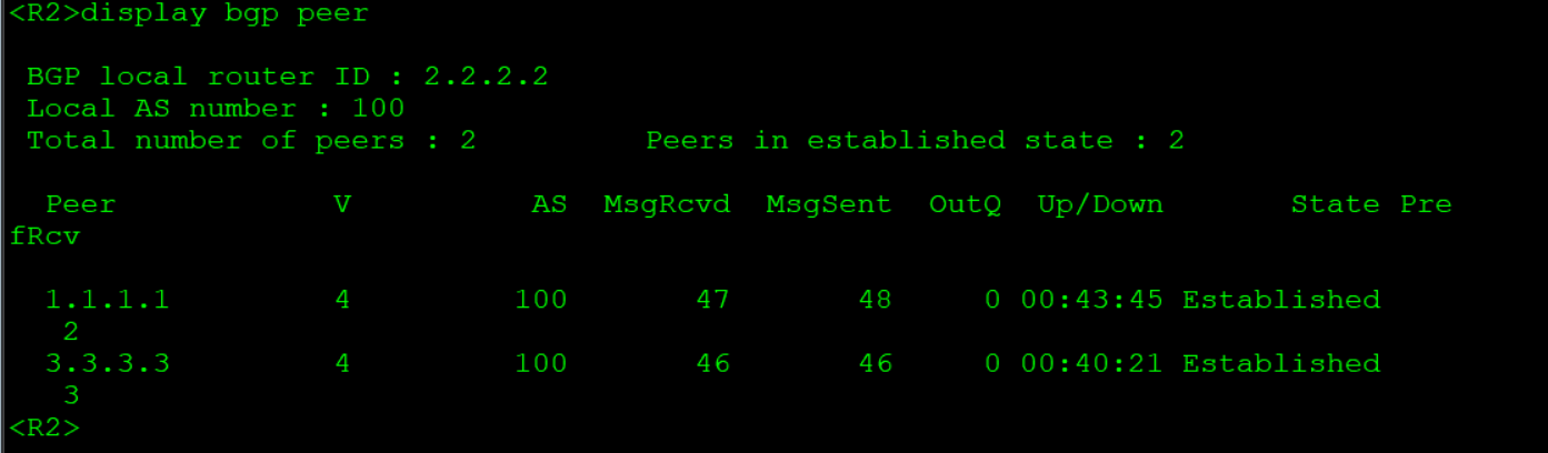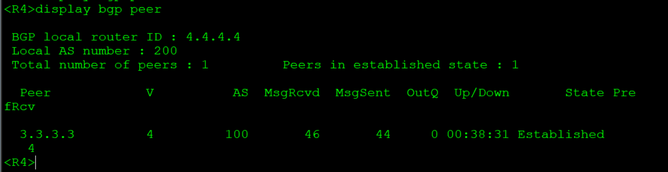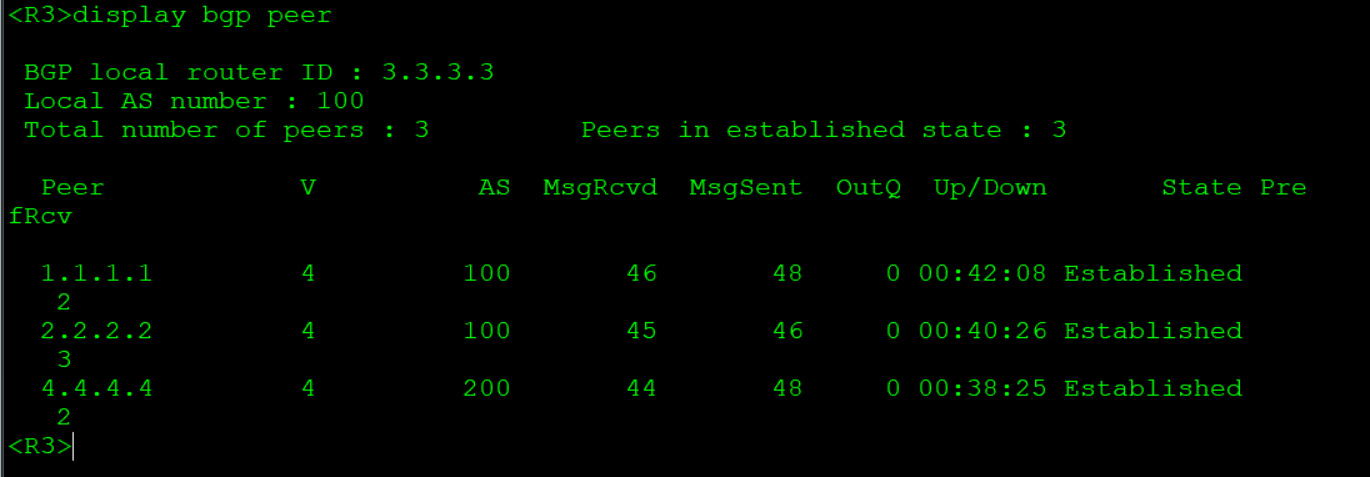 R1: bgp 100 #创建bgp,进程号为100 router-id 1.1.1.1 #设置router-ID peer 2.2.2.2 as-number 100 #设置对等体AS号 peer 2.2.2.2 connect-interface LoopBack0 #对等体更新源设为loopback 0 peer 2.2.2.2 next-hop-local #设置对等体可达 peer 3.3.3.3 as-number 100 #设置对等体AS号 peer 3.3.3.3 connect-interface LoopBack0 #对等体更新源设为loopback 0 peer 3.3.3.3 next-hop-local #设置对等体可达 network 1.1.1.1 32 #宣告直连网段 network 12.12.12.0 24 #宣告直连网段 R2: bgp 100 #创建bgp,进程号为100 router-id 2.2.2.2 #设置router-ID peer 1.1.1.1 as-number 100 #设置对等体AS号 peer 1.1.1.1 connect-interface LoopBack0 #对等体更新源设为loopback 0 peer 3.3.3.3 as-number 100 #设置对等体AS号 peer 3.3.3.3 connect-interface LoopBack0 #对等体更新源设为loopback 0 network 2.2.2.2 32 #宣告直连网段 network 12.12.12.0 24 #宣告直连网段 network 13.1.1.0 24 #宣告直连网段 R3: bgp 100 #创建bgp,进程号为100 router-id 3.3.3.3 #设置router-ID peer 1.1.1.1 as-number 100 #设置对等体AS号 peer 1.1.1.1 connect-interface LoopBack0 #对等体更新源设为loopback 0 peer 1.1.1.1 next-hop-local #设置对等体可达 peer 2.2.2.2 as-number 100 #设置对等体AS号 peer 2.2.2.2 connect-interface LoopBack0 #对等体更新源设为loopback 0 peer 2.2.2.2 next-hop-local #设置对等体可达 peer 4.4.4.4 as-number 200 #设置对等体AS号 peer 4.4.4.4 connect-interface LoopBack0 #对等体更新源设为loopback 0 peer 4.4.4.4 ebgp-max-hop 255 #对等体跳数设为255 ip route-static 4.4.4.4 32 23.23.23.2 #设置静态路由确保R4与R3互通 network 3.3.3.3 255.255.255.255 #宣告直连网段 network 13.1.1.0 255.255.255.0 #宣告直连网段 network 23.23.23.0 255.255.255.0#宣告直连网段 R4: bgp 200 #创建bgp,进程号为200 router-id 4.4.4.4 #设置router-ID peer 3.3.3.3 as-number 100 #设置对等体AS号 peer 3.3.3.3 connect-interface LoopBack 0 #对等体更新源设为loopback 0 peer 3.3.3.3 ebgp-max-hop 255 #对等体跳数设为255 network 4.4.4.4 255.255.255.255 #宣告直连网段 network 23.23.23.0 255.255.255.0#宣告直连网段