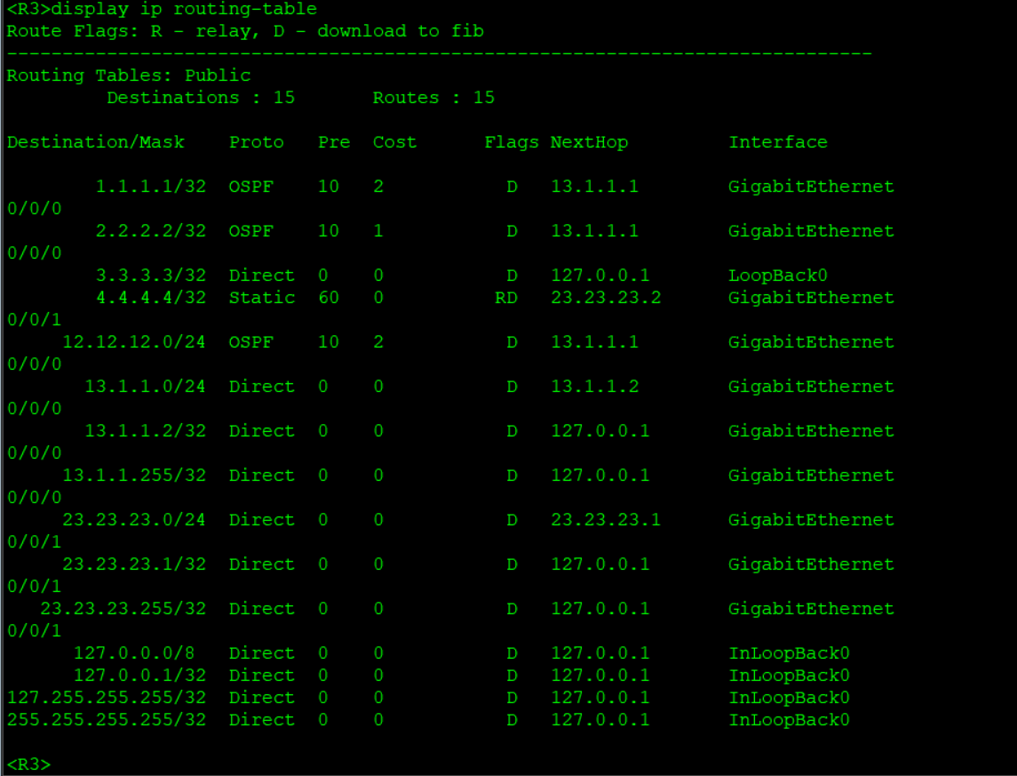 R1: ospf 1 router-id 1.1.1.1 #创建ospf,进程号为1,配置路由ID为本设备回环地址 area 0 #创建区域0为骨干区域 network 1.1.1.1 0.0.0.0 #宣告本地回环地址 network 12.12.12.0 0.0.0.255 #宣告直连网段 R2: ospf 1 router-id 2.2.2.2 #创建ospf,进程号为1,配置路由ID为本设备回环地址 area 0 #创建区域0为骨干区域 network 2.2.2.2 0.0.0.0 #宣告本地回环地址 network 12.12.12.0 0.0.0.255 #宣告直连网段 network 13.1.1.0 0.0.0.255 #宣告直连网段 R3: ospf 1 router-id 3.3.3.3 #创建ospf,进程号为1,配置路由ID为本设备回环地址 area 0 #创建区域0为骨干区域 network 3.3.3.3 0.0.0.0 #宣告本地回环地址 network 13.1.1.0 0.0.0.255 #宣告直连网段