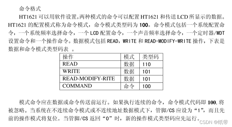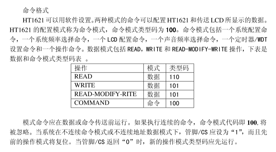 cs:cs脚用于初始化串行接口电路和结束主控制器与HT1621之间的通讯,cs设置为1 时主控制器和HT1621之间的数据和命令无效并初始化。在产生模式命令或模式转换之前必须用一个高电平脉冲初始化HT1621的串行接口。