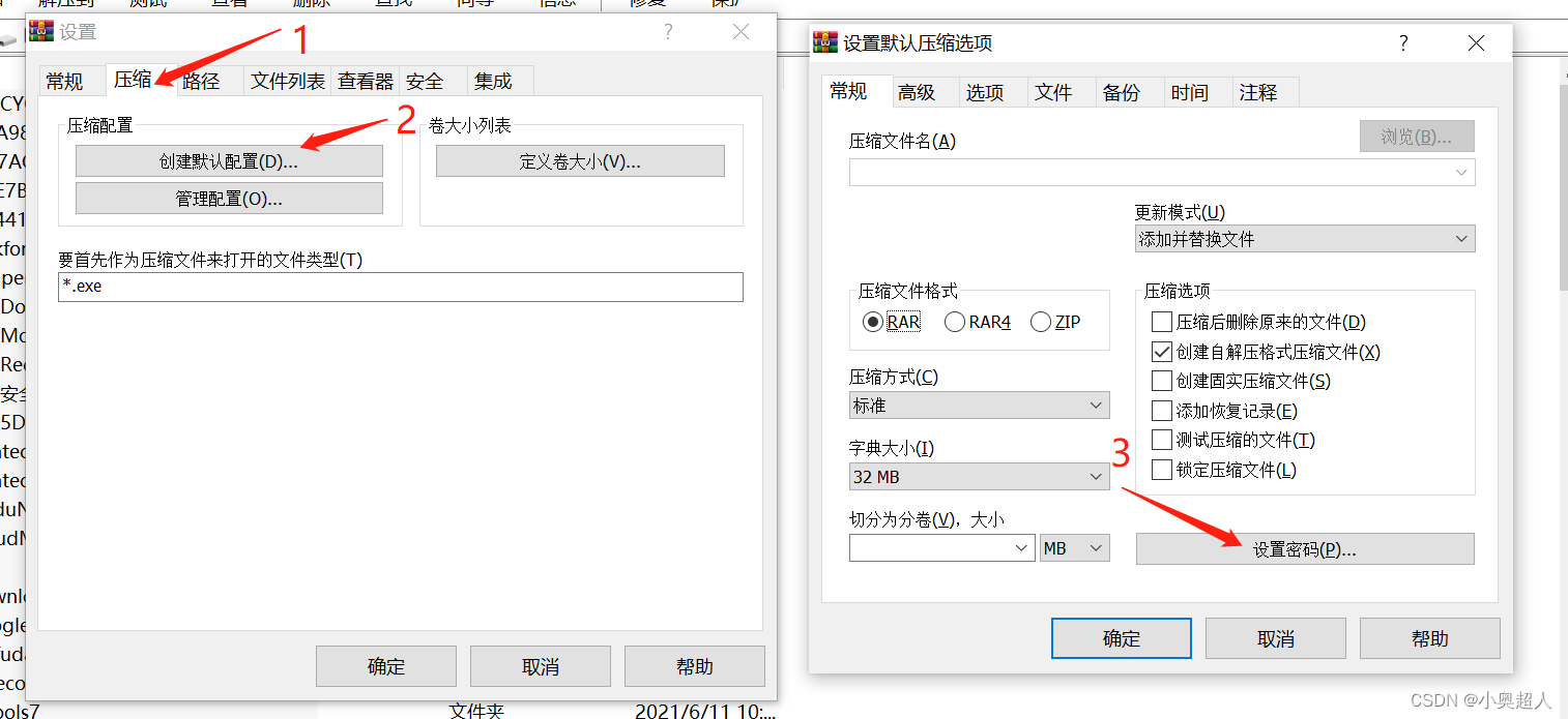然后切换到【压缩】选项卡,点击【创建默认配置】,在新弹出的提示框中选择【设置密码】