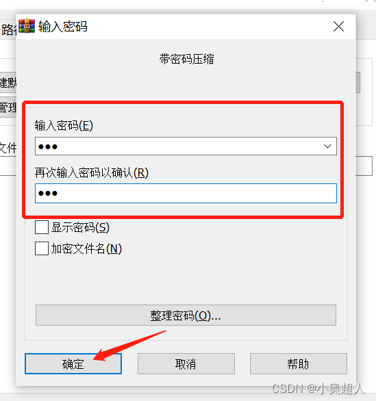 在这里输入我们想要设置的密码,点击确定就完成设置了,我们只需要正常压缩文件即可。