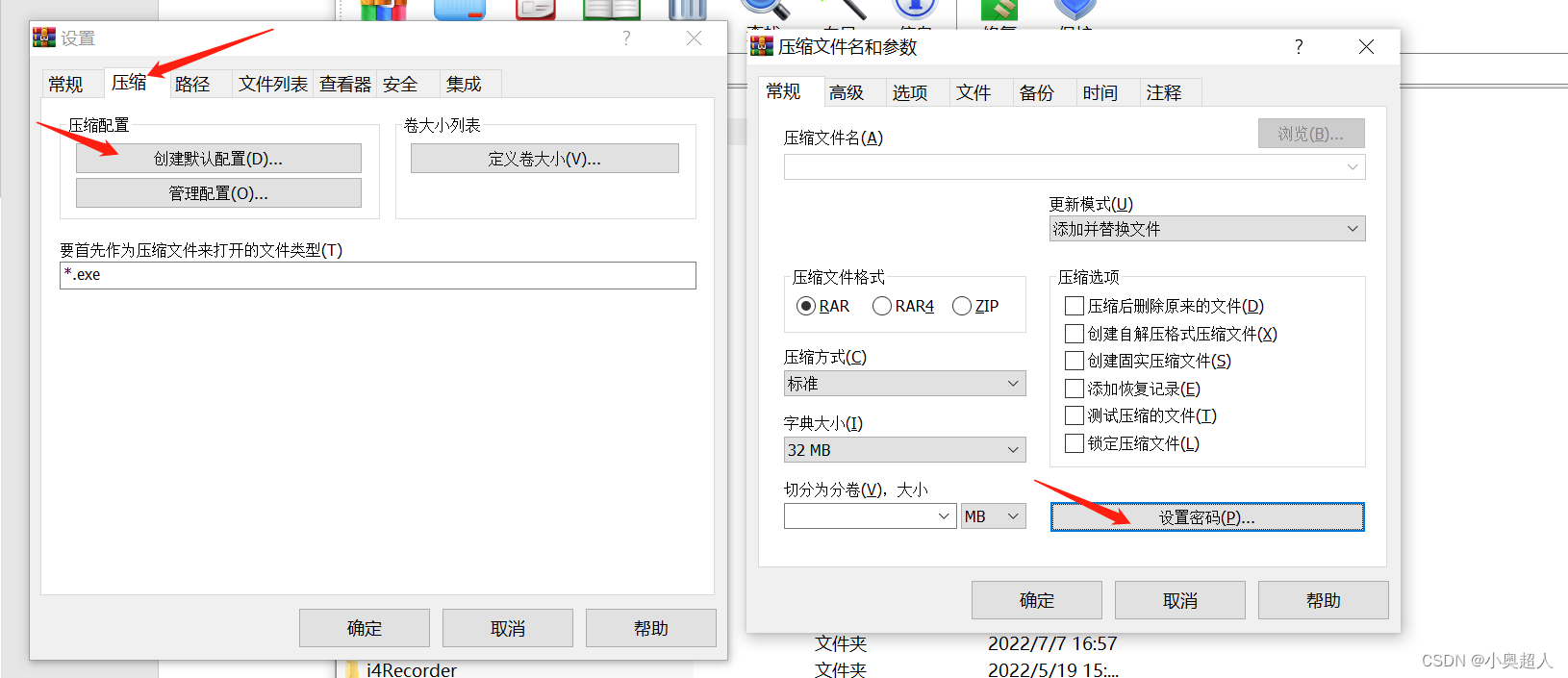 设置界面中,切换到【压缩】,点击 创建默认配置 – 设置密码