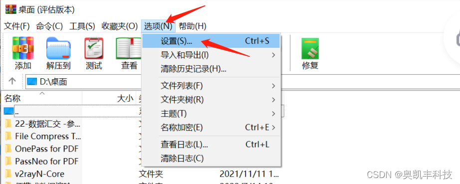 打开WinRAR之后,点击工具栏中的选项 – 设置