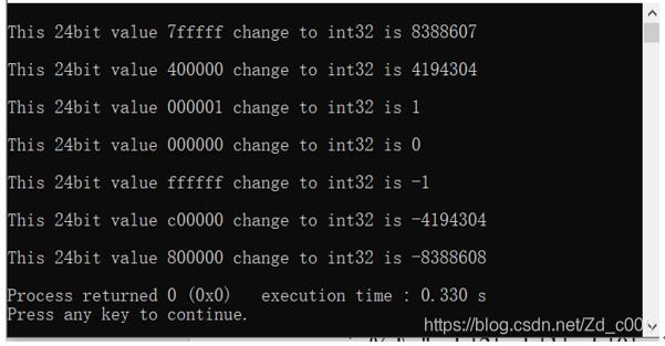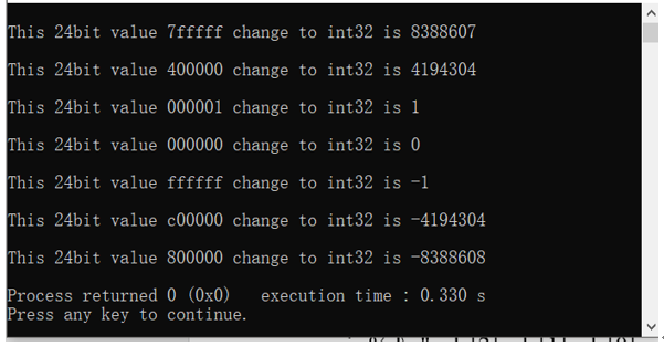 {int i;for(i = 0; i < 7; i++){adc[0] = LL[i];adc[1] = MM[i];adc[2] = HH[i];value = adc24to32(adc);printf("\nThis 24bit value %02x%02x%02x change to int32 is %d\n",adc[2],adc[1],adc[0],value);}return 0;