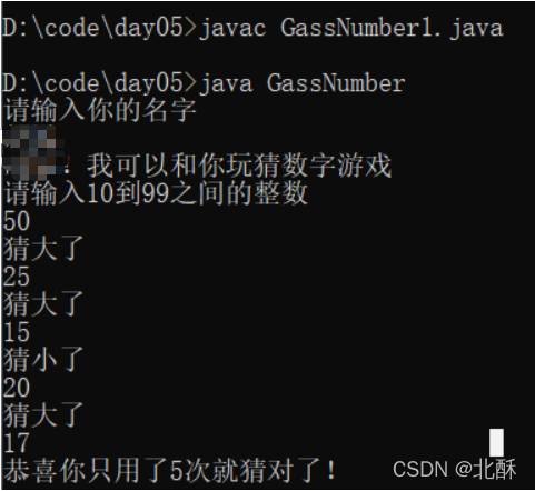 import java.util.Scanner;class GassNumber{public static void main(String[] args){Scanner scan = new Scanner(System.in);System.out.println("请输入你的名字");String name = scan.next();System.out.println(name + "!我可以和你玩猜数字游戏");System.out.println("请输入10到99之间的整数");int x1 = scan.nextInt();int count = 1;//用的是do-while所以第一次猜数也算int num = (int)(Math.random() * 90 + 10);do{if(x1 > num){System.out.println("猜大了");}else if(x1 < num){System.out.println("猜小了");}count ++;x1 = scan.nextInt();}while(num != x1);System.out.println("恭喜你只用了" + count + "次就猜对了!");