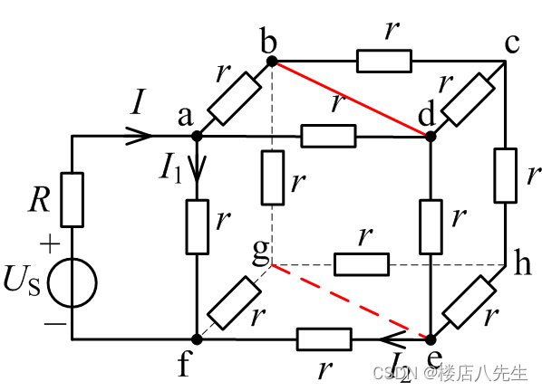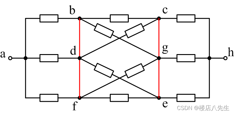 解析:对端口ah,有achf和adhg两个传递对称面,因此b、d、f三点等电位,c、g、e也是等电位点,分别将它们短路,得等效电路如图8所示。