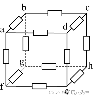 解析:标注立方体电阻网络各结点如图10所示,对端口af,平面achf是其传递对称面,所以b、d等电位,e、g等电位,将它们分别短接,可得端口af的等效电阻为
