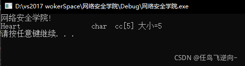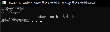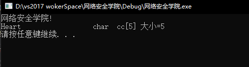 {char cc[5]={'H','e','a','r','t'};//注意要用单引号来表示字符类型哦printf("%c",cc[0]);//打印数组第一个元素从0索引开始 这里可能有的同学会不太明白 不要着急 后面会讲解 这里只是提及一下printf("%c",cc[1]);printf("%c",cc[2]);printf("%c",cc[3]);printf("%c",cc[4]);printf(" char cc[5] 大小=%d\n",sizeof(cc));system("pause");//暂停的意思 以免控制台消失