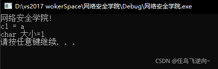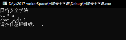 {char c1='a';printf("c1 = %c\n",c1);//%c表示 输出的值的类型是 字符类型printf("char 大小=%d\n",sizeof(char)); system("pause");//暂停的意思 以免控制台消失