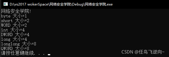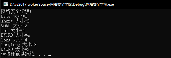 {byte a=1;short b=2;WORD c=3;int d=3;DWORD e=4;long f=5;longlong g=6;QWORD h=7;printf("byte 大小=%d\n", sizeof(byte));printf("short 大小=%d\n", sizeof(short));printf("WORD 大小=%d\n", sizeof(WORD));printf("int 大小=%d\n", sizeof(int));printf("DWORD 大小=%d\n", sizeof(DWORD));printf("long 大小=%d\n", sizeof(long));printf("longlong 大小=%d\n", sizeof(long long));printf("QWORD 大小=%d\n", sizeof(QWORD));system("pause");//暂停的意思 以免控制台消失