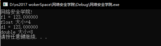 {float f1 = 123.0f;//这里注意浮点数要用到f结尾来赋值数据printf("f1 = %f\n",f1);printf("float 大小=%d\n",sizeof(float));double d1 = 123.0f;//这里注意浮点数要用到f结尾来赋值数据printf("d1 = %f\n",d1);printf("double 大小=%d\n",sizeof(double));system("pause");//暂停的意思 以免控制台消失