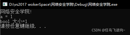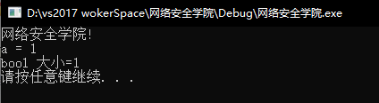 {bool a = 123;printf("a = %d\n",a);printf("bool 大小=%d\n",sizeof(bool));system("pause");//暂停的意思 以免控制台消失
