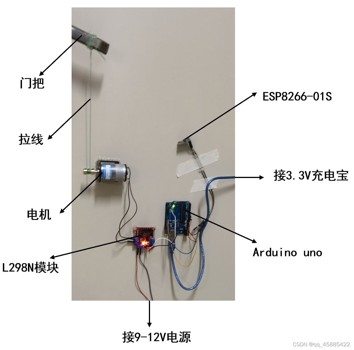 参考Arduino+esp8266-01+舵机 制作基于局域网的遥控门禁这篇文章,我便开始制作装置和写代码。但在做好上门的时候发现,这样一个舵机完全拉不动门把,试了试,我们这门把不仅用力大而且要转动很大幅度,无可奈何,我最后只好换成一个强力电机,拉力在7.2kg左右才勉强拉得动。在使用很久之后,发现这个门把手质量真好力很大,都拉断了几次绳子,甚至还把用热熔胶粘的电机给扯下来了。而且绳子会因为多次的拉动变形伸长甚至断裂,对误差归零会有一定影响。