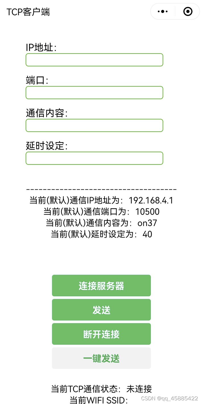 其中,每个框的内容默认就有,因此可以直接发送,而不需要填写内容,而当改变通信内容时,在框中输入新的即可。对于一般的发送过程为连接-发送-断开连接,而为了实现一键发送,把三部分综合起来即可实现。