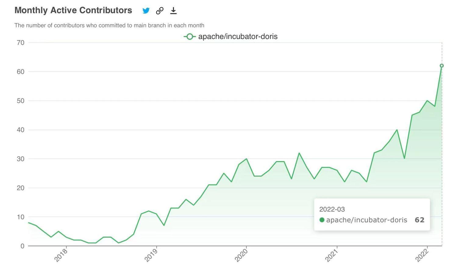 与此同时,Apache Doris 的贡献者数量已超过 300 人( 点击回顾:社区动态|Apache Doris 迎来第 300 位 Contributor !),每月活跃的贡献者数量超过了 60 人,近几周平均每周提交的 Commits 数量也超过 80,社区聚集的开发者规模及活跃度已经有了极大的提升。我们十分期待有更多的小伙伴参与社区贡献中来,与我们一道把 Apache Doris 打造成全球顶级的分析型数据库,也期待所有小伙伴可以与我们一起收获宝贵的成长。如果你想参与社区,欢迎通过开发者邮箱 dev@doris.apache.org 与我们取得联系。