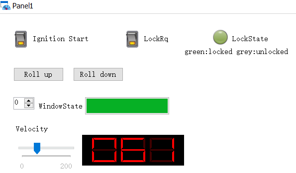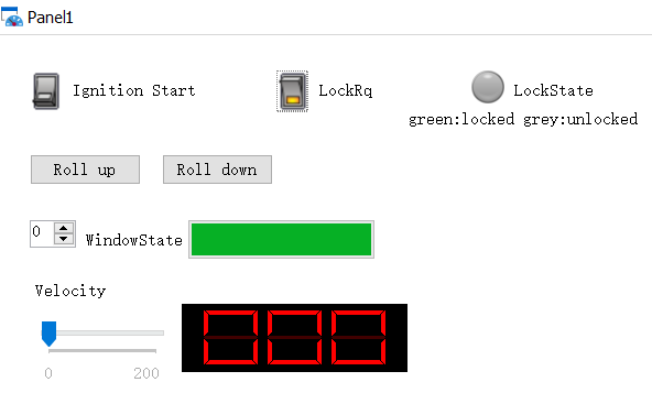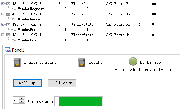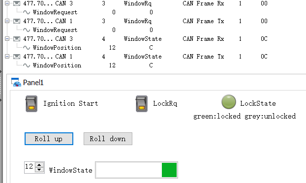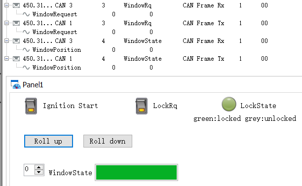 随后,我们按一下Roll up按钮,也就是升起车窗,可以看到信号WindowPosition的值在递减,直到减为最小值0,同时绿色长方条也在形象地展示窗户在被升起的过程。Roll up按钮被按下的时候,信号WindowRequest的值为1,即发出升起窗户的请求。Roll up按钮松开后,信号WindowRequest的值为0,因为不是视频展示,所以看不到这个变化。