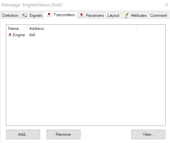 注意设置报文的DLC(Data LengthCode).选择Transmitters选项卡并单击[Add]。选择“Engine”,然后单击[OK]。