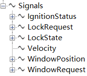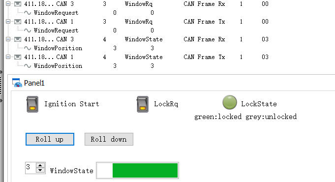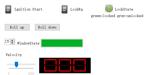 随后,我们按一下Roll down按钮,也就是降落车窗,可以看到信号WindowPosition的值在递增,直到增加为最大值15,同时绿色长方条也在形象地展示窗户在被降落的过程。Roll down按钮被按下的时候,信号WindowRequest的值为2,即发出降落窗户的请求。Roll down按钮松开后,信号WindowRequest的值为0,因为不是视频展示,所以看不到这个变化。