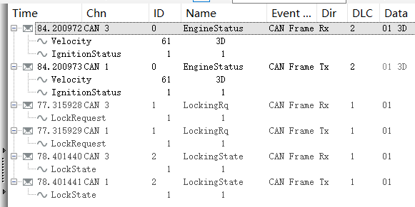 随后,我们在面板将LockRq打开,也就是将车解锁。这时候,我们可以看到LockState按钮变灰了,意味着车辆状态是unlocked。同时可以看到CAN1口发送了报文LockingRq和LockingState。其中信号LockRequest值为1,意味着发出了解锁的请求,LockState值为1,意味着车是解锁状态。具体关于信号赋值的意义,可以查看下面关于value tables的创建。