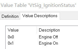 双击“Signals”下的“IgnitionStatus"”。在弹出的窗口中,在value tables的下拉框中选择“VtSig_IgnitStatus”。单击[OK]。