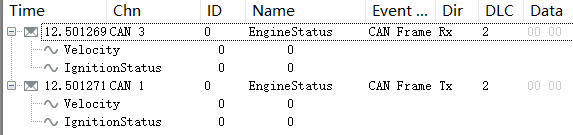 首先可以看到CAN1口周期性地发送了报文EngineStatus,其中有两个信号,Velocity和IgnitionStatus。面板变量的初始状态如图所示。