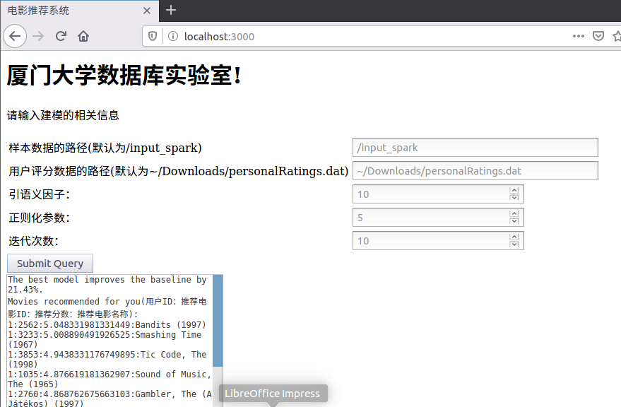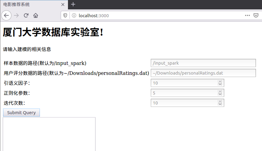 app.post('/',function(req, res){ const path = req.body.path.trim() || '/input_spark' const myRatings = req.body.myRatings.trim() || '~/Downloads/personalRatings.dat' const bestRank = req.body.bestRank.trim() || 10 const bestLambda = req.body.bestLambda.trim() || 5 const bestNumIter = req.body.bestNumIter.trim() || 10 let spark_submit = spawnSync('/usr/local/spark/bin/spark-submit',['--class', 'recommend.MovieLensALS',' ~/IdeaProjects/Spark_Recommend/out/artifacts/Spark_Recommend_jar/Spark_Recommend.jar', path, myRatings, bestRank, bestLambda, bestNumIter],{ shell:true, encoding: 'utf8' }) res.render('index', {title: '电影推荐系统', message: '厦门大学数据库实验室!', result: spark_submit.stdout}) })