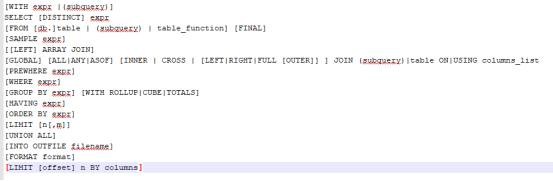 ①LIMIT BY和LIMIT所有不同,它运行于ORDER BY之后和LIMIT之前,能够按照指定分组,最多返回前n行数据(如果数据少于n行,则按实际数量返回),常用于TOP N的查询场景。