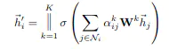 我们得到这个归一化的系数后,将其与对应的特征向量作线性的组合,将结果作为每个这样的中心节点的更新后的特征向量(在通过一个非线性激活函数σ之后):