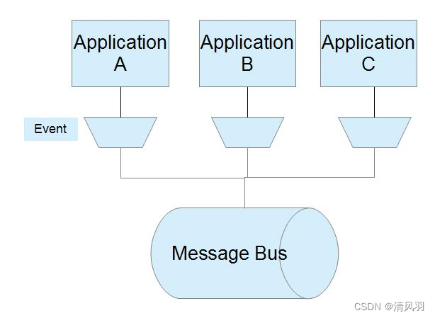 所有应用之间要通信的消息都通过消息队列来传输,由消息队列来保证数据传输的异步性、稳定性等。总的来说,这看起来有点像网络连接结构。所有数据通过一条可靠的链路来进行通信。
