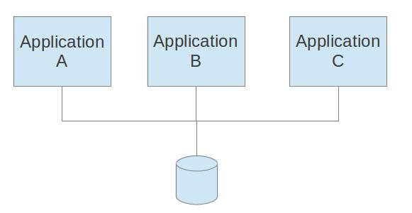 还有一种集成方式也比较常见,就是共享数据库。在很多应用开发的场景下,我们的数据库是相对独立提供服务的一部分。所以对于其他系统的对接也就比较容易,这种集成的方式如下图: