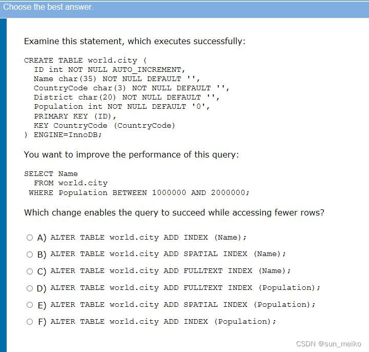 You want to improve the performance of this query: SELECT Name FROM world.city WHERE Population BETWEEN 1000000 AND 2000000; Which change enables the query to succeed while accessing fewer rows? A) ALTER TABLE world.city ADD INDEX (Name) ; B) ALTER TABLE world.city ADD SPATIAL INDEX (Name) ; C) ALTER TABLE world.city ADD FULLTEXT INDEX (Name) ; D) ALTER TABLE world.city ADD FULLTEXT INDEX (Population) ; E) ALTER TABLE world.city ADD SPATIAL INDEX (Population) ; F) ALTER TABLE world.city ADD INDEX (Population) ;