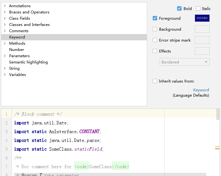 点击Language Defaults设置默认属性,可点击列表或直接点击下方案例进行设置默认属性,单选加粗/斜体、颜色等,如图为关键字key的默认设置