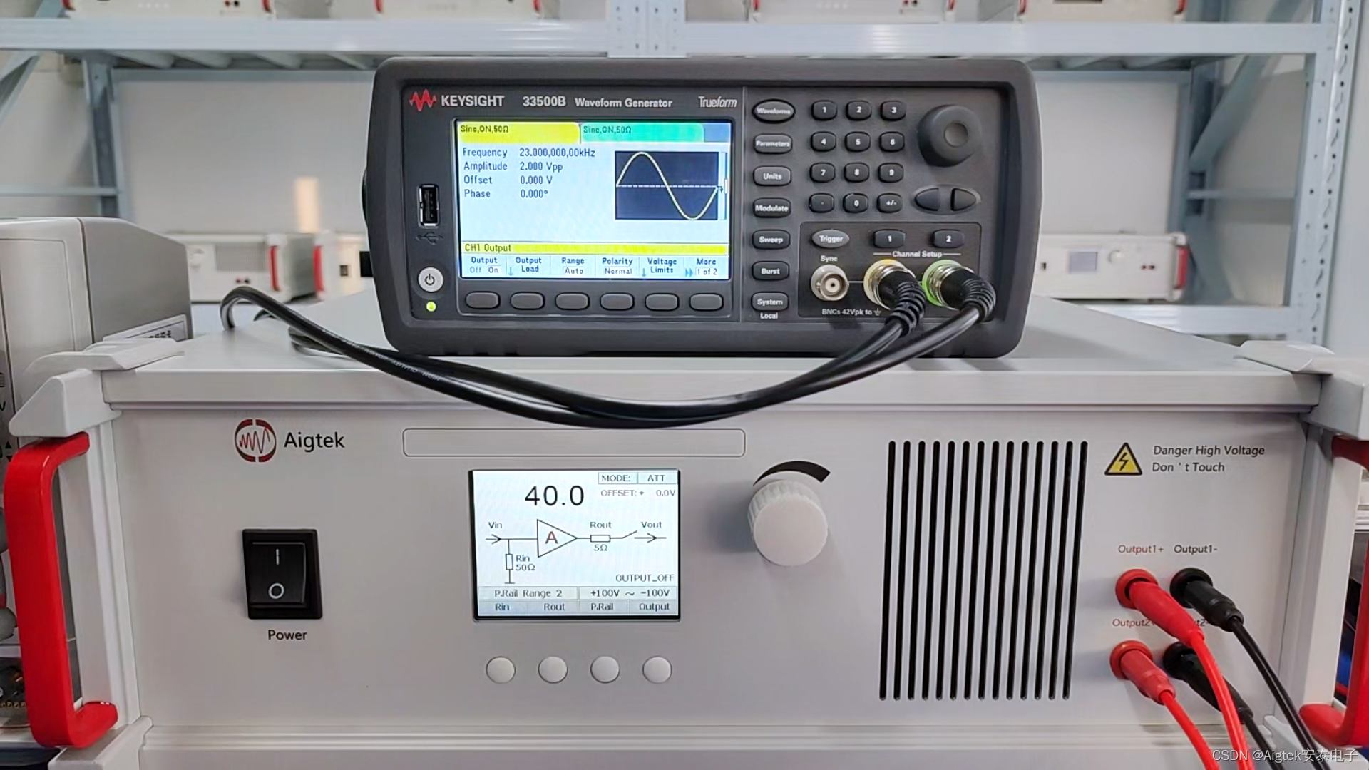 2、信号发生器的输入阻抗设置为50Ω、和功率放大器的输入阻抗进行匹配,频率设置为23kHz,电压设置为2Vp-p;